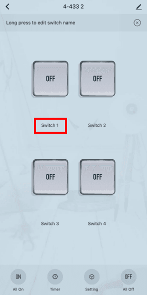 To rename your device’s switches, go into your device, tap and hold the switch’s name (refer to Figure 1). To rename your device, go to the pencil icon in the top right-hand corner. Then tap on 4-433, then tap on the name to rename your device (refer to Figure 2).