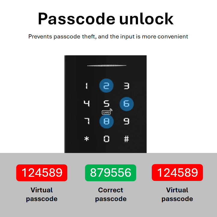 • Keypad protection: The keypad locks for 5 minutes after multiple failed passcode attempts.